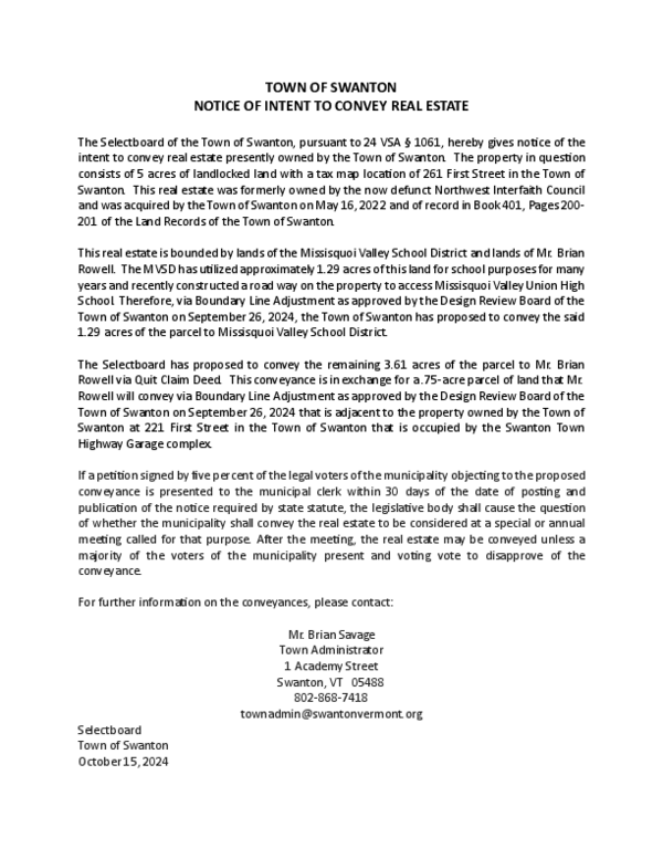 The Selectboard of the Town of Swanton, pursuant to 24 VSA ยง 1061, hereby gives notice of the intent to convey real estate presently owned by the Town of Swanton. The property in question consists of 5 acres of landlocked land with a tax map location of 261 First Street in the Town of Swanton. This real estate was formerly owned by the now defunct Northwest Interfaith Council and was acquired by the Town of Swanton on May 16, 2022 and of record in Book 401, Pages 200-201 of the Land Records of the Town of Swanton.