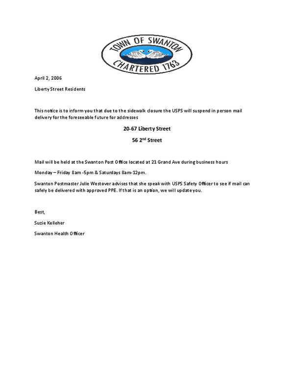 Swanton Postmaster Julie Westover advises that she speak with USPS Safety Officer to see if mail can safely be delivered with approved PPE. If that is an option, we will update you.