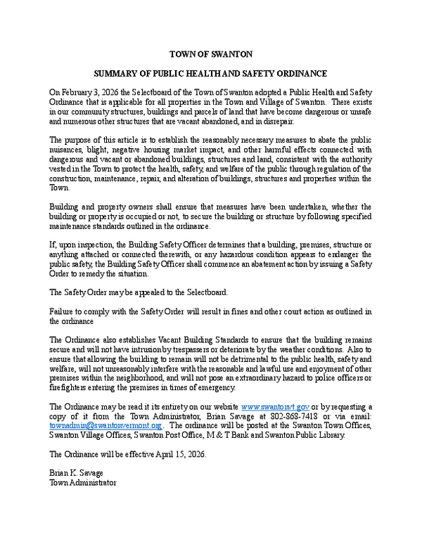 On February 3, 2026 the Selectboard of the Town of Swanton adopted a Public Health and Safety Ordinance that is applicable for all properties in the Town and Village of Swanton. There exists in our community structures, buildings and parcels of land that have become dangerous or unsafe and numerous other structures that are vacant abandoned, and in disrepair.